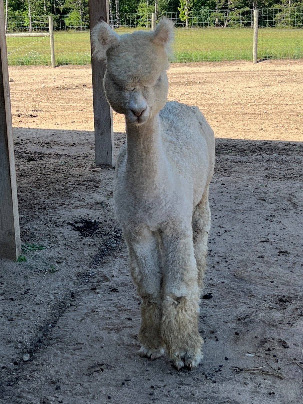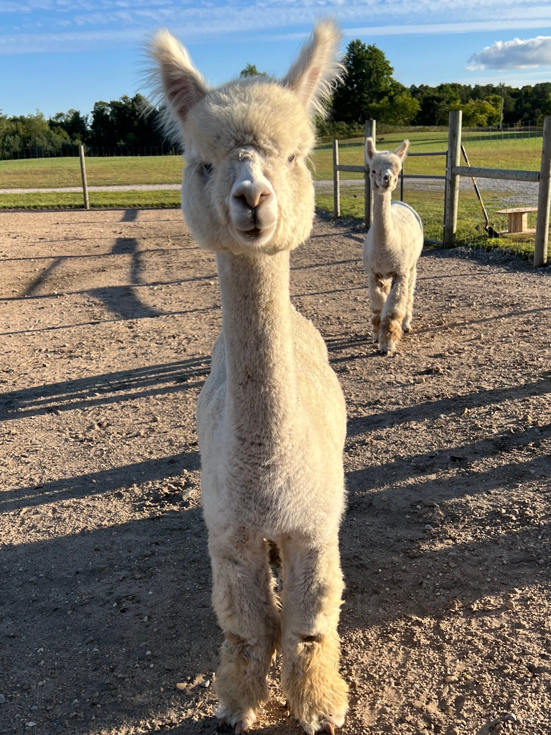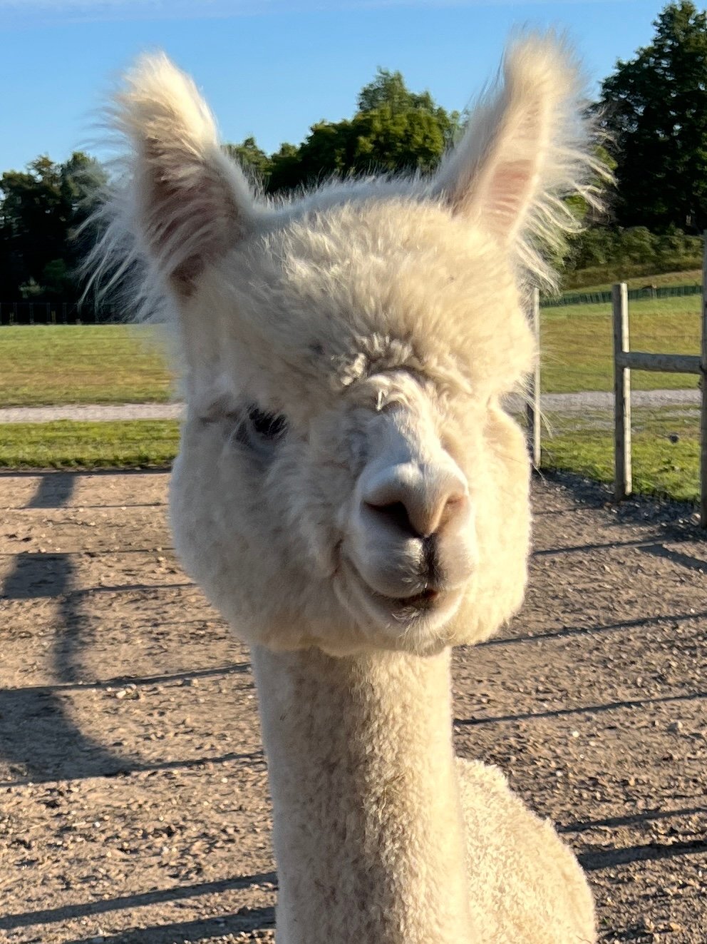 Her fiber is beautiful! It has a long staple, high frequency crimp structure, lovely bundles, and it is bright. She is lacking density, but we know her age, cria coat, and long staple length is influencing this trait. We fully expect density to arrive after we shear and she matures.