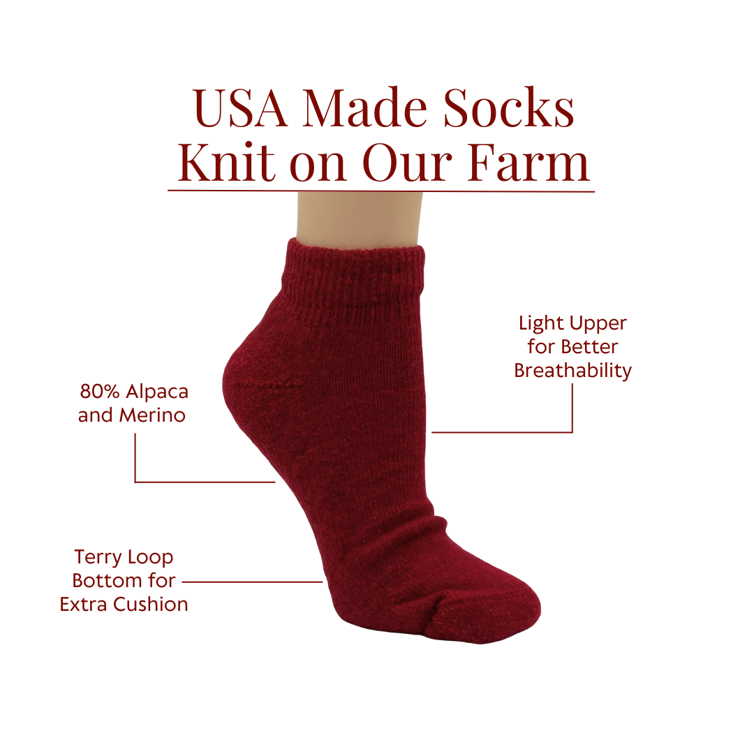 Our half terry loop alpaca socks offer a blend of warmth and comfort that is ideal for people who want a warm cushion bottom combined with a light, breathable upper. These socks were inspired by a tour group we had visiting our farm. The seniors wanted a warm sock that was cushioned and warm, but also low profile and adaptable to any weather condition. We promised the group we would make this style as our first socks knit on our farm and we did.